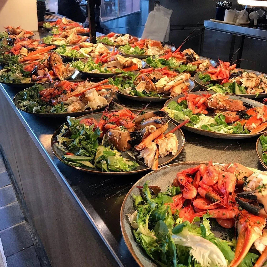 Vi serverer skalldyr-tallerken, bestående av kreps, krabbe, reker og focaccia med aoili.